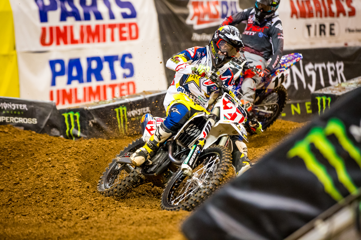 Jason Anderson has been the standout surprise of the 2018 Monster Energy Supercross season. Anderson’s steadily increasing racing IQ and more assertive racing style has proved to be his greatest ally during this season. In a season where riders are suffering season-ending injuries right and left, consistency has been the greatest tool for the Rockstar Energy Husqvarna Factory Racing rider. Anderson finished in second place in St. Louis and holds a 42-point lead over Marvin Musquin heading into Round 12. His teammate in the 250 class, Zach Osborne, has also not wasted any time asserting himself as a force to be reckoned with in the Eastern Regional Championship. As the defending champion in the Eastern Regional class, the goal for Osborne is obviously to carry the red plates all the way to finals. Zach Osborne launched himself to holeshot line on Saturday, and then was passed by Austin Forkner. Forkner led about half of the race, but Zach is another rider with extremely high racer IQ. His near decade of experience as a professional racer has certainly served him well. As we waited patiently for his moment, Forkner unfortunately went down, which allowed Osborne an opportunity for an easy pass. Osborne went on to win the 250 Main Event in St. Louis and regained the sole points lead for the Eastern Regional Championship. The Rockstar Energy Husqvarna Factory Racing team currently holds two of three available red plates and looks to maintain their dominance as we head to Indianapolis for Round 12 this weekend.