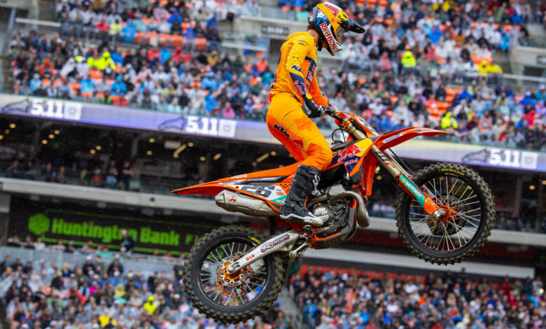 Two-time 450SX Champion Tomac entered Cleveland only 15 points outside of the red plate, however, a heavy crash in the whoops during this morning’s Q1 session would ultimately end his weekend.