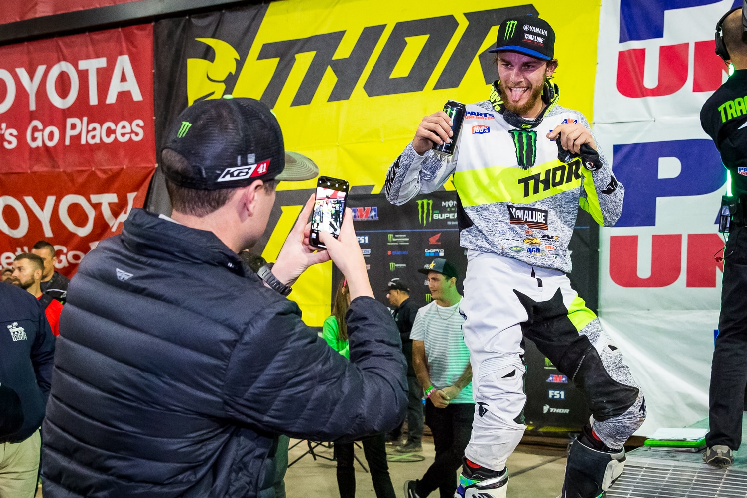 We’ve touched on the fact that competition is stacked this season, so much so that the red plates have changed hands in the 250SX class during each of the four rounds of racing thus far. This is one of those seasons where there is no clear title contender, even four weeks in, and every rider needs to have a nearly perfect ride every week in order to even be considered competitive. In Glendale, the #23 of Aaron Plessinger got off to an unusually good start and the extremely technical track played heavily to his racing strengths. He battled fiercely with the #28 of Shane McElrath for a good portion of the Main Event, before passing him in an uncharacteristically aggressive move. We can chalk this move up to a “bad math” racing incident. Sure, Plessinger was eager to make the pass for the lead, but his calculations for how the pass was going to go down were just a tad off and almost sent Shane straight to the ground. AP would maintain the lead for the rest of the Main Event, landing him on the top step of the podium for the second time this season. This win nudges him just ahead of Shane McElrath and Joey Savatgy to be the sole points leader as we head into Oakland. After claiming the checkers, fans were once again treated to some spectacular dance moves that we’ve become accustomed to from the #23.