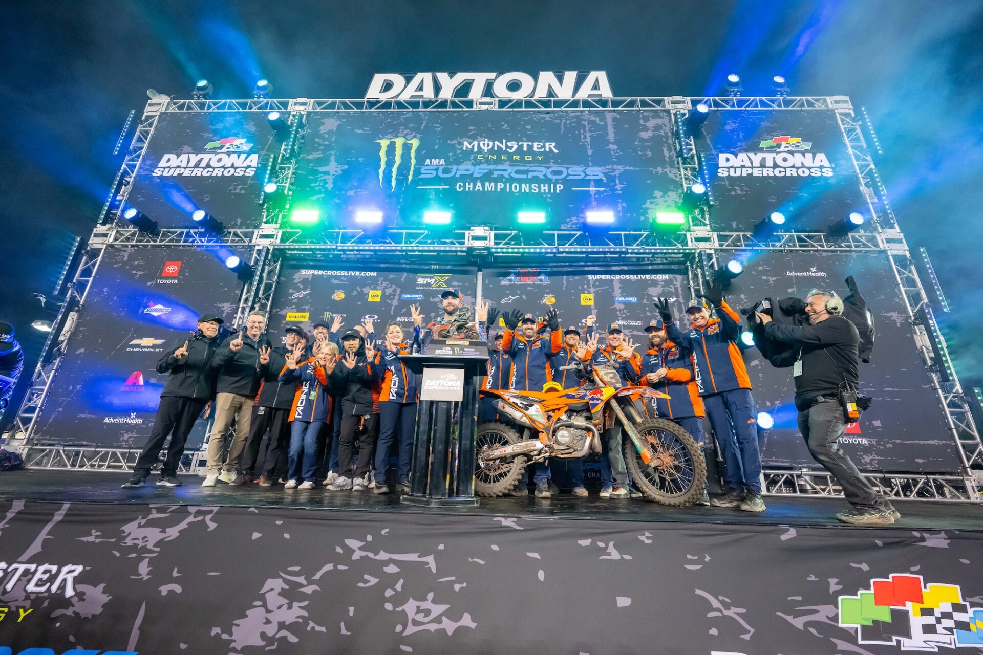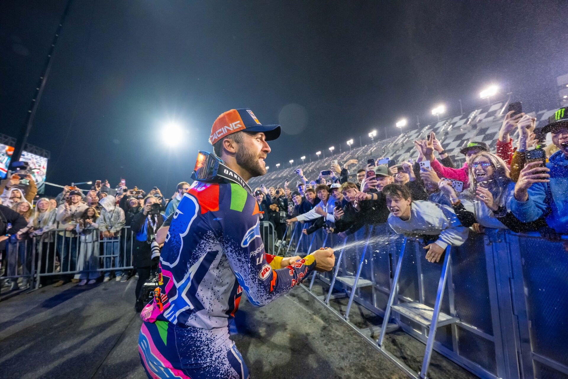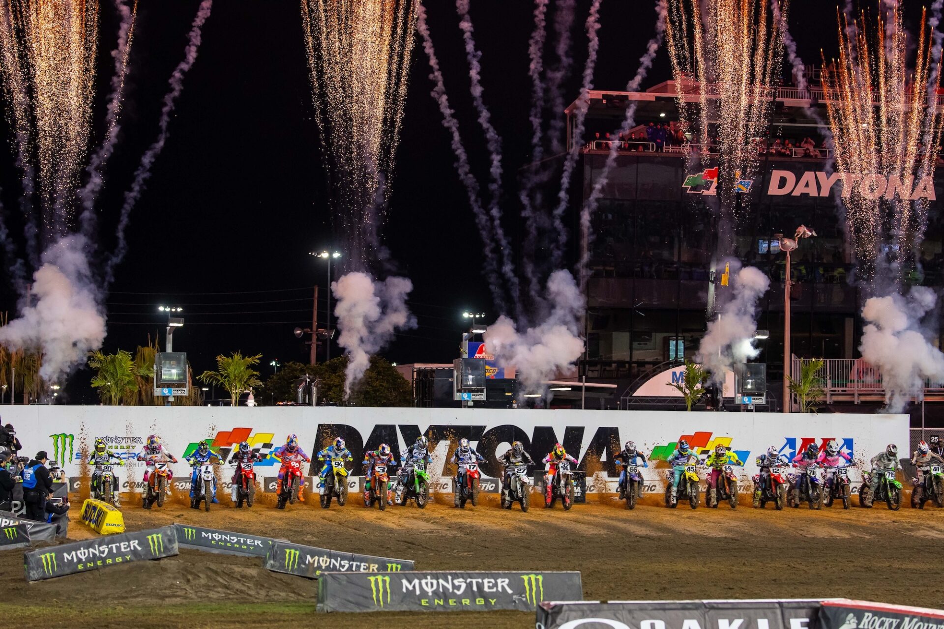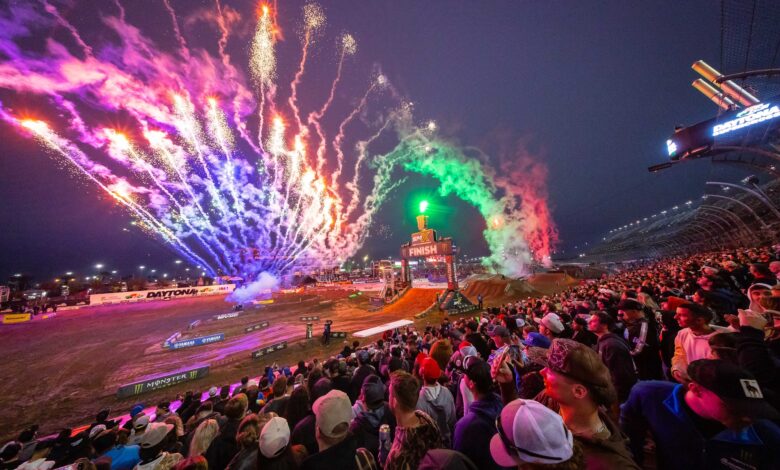 The gate drops on the 450SX main event. The view from behind the gate in the 250SX East main event. Cooper Webb was fast in Daytona, but was a little off the pace of the top 3 riders. Webb struggled to find the pace of the leaders in the 450SX main event. Eli Tomac had to pass points leader Hunter Lawrence to take the lead in the 450SX main event.Triumph Factory Racing took their first SMX Next win in Daytona. It seems like every weekend these two are battling. The Daytona track has multiple lines in all of the corners. Hunter Lawrence did just enough in Daytona to hold onto the red plates heading into Round 9. The 450SX class make their way around the track on the opening lap of the main event. Seth Hammaker took his first win of 2026 in the 250SX East main event. Cole Davies was fast in Daytona and looks to be getting better each weekend. As it every year, the Daytona Speedway stands were packed on Saturday night. Eli Tomac celebrates with the fans after his big win. There is nothing quite like the fireworks in Daytona! Tomac shows us how many wins he has in Daytona. Eli holds up the trophy that broke and knocked a tooth out a few minutes before. Your 450SX class podium. Thanks to Eli Tomac, the KTM Factory Team is having one heck of a year so far in 2026.