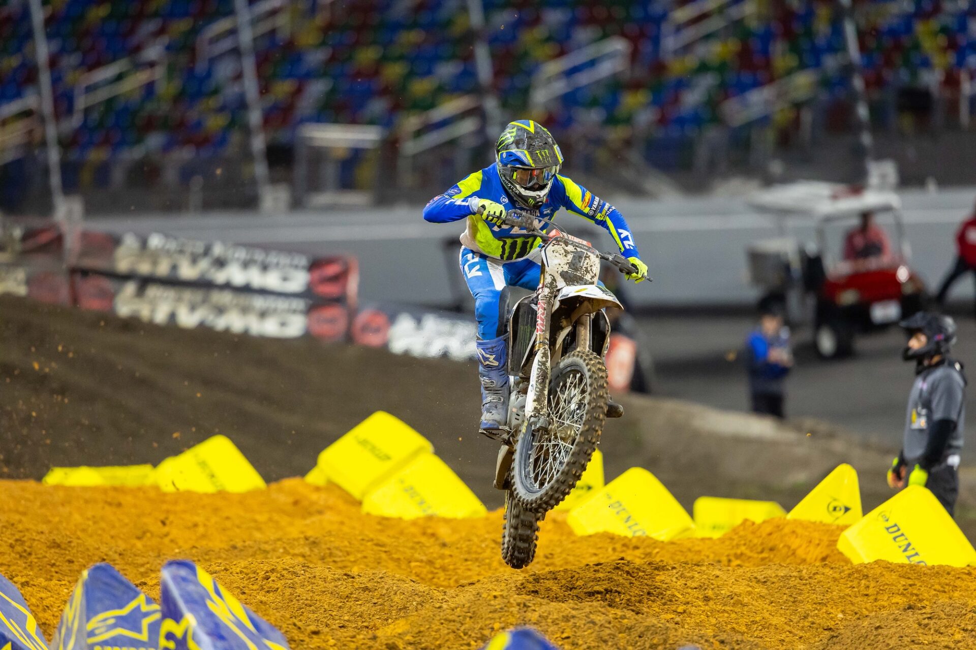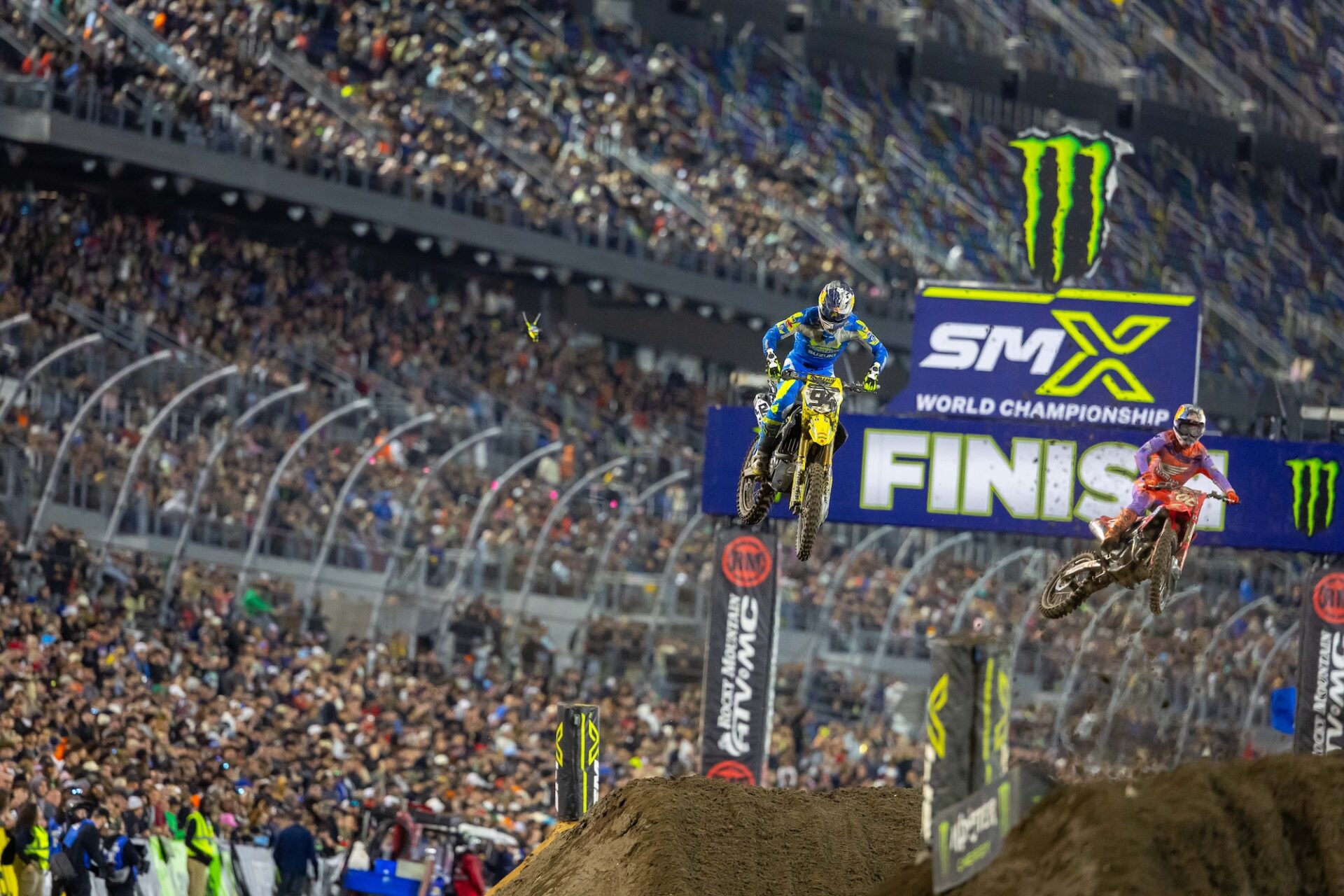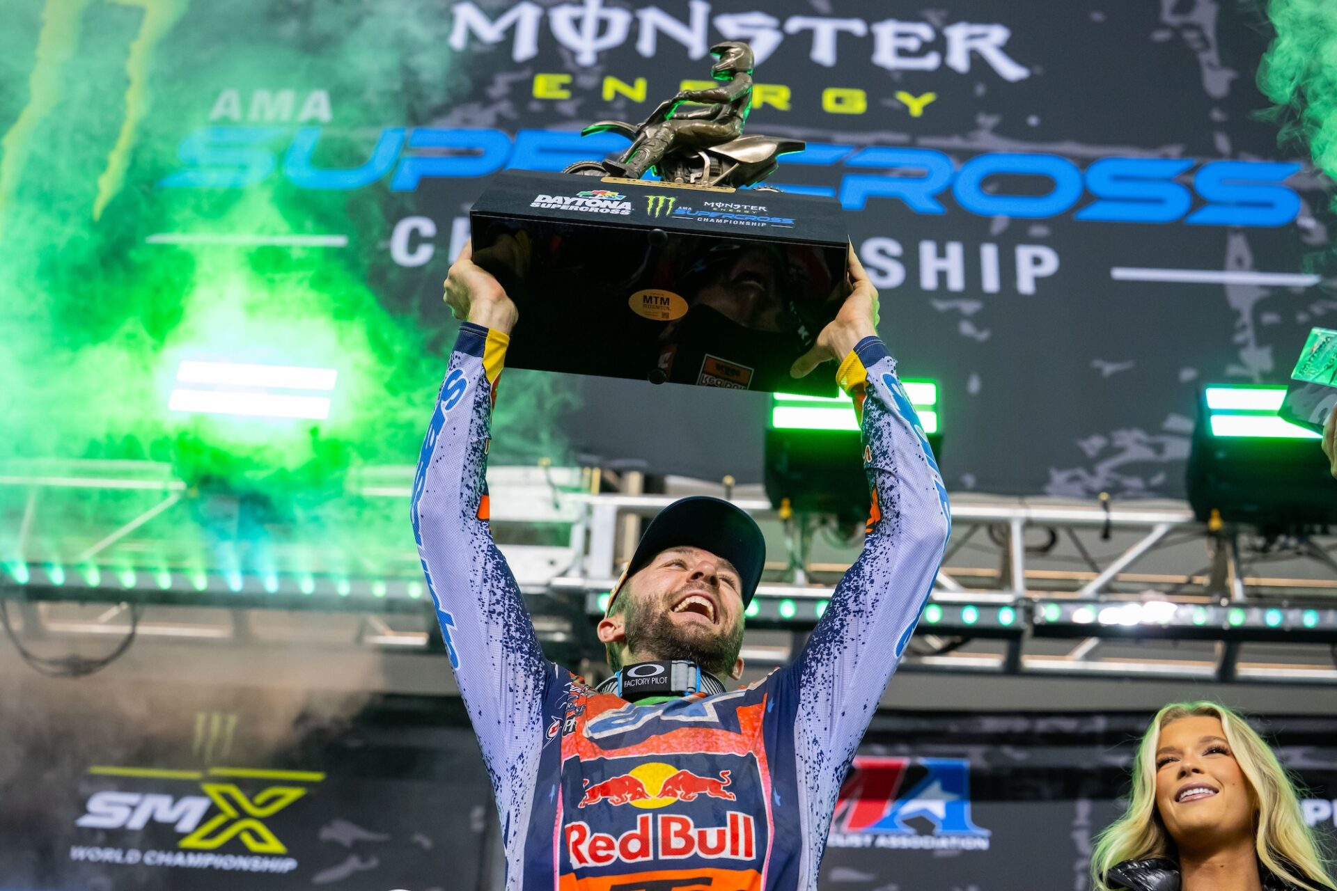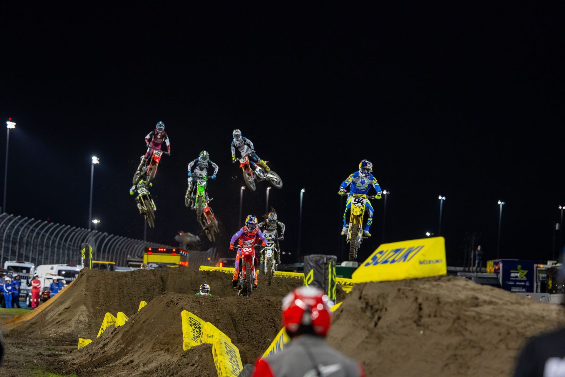 The gate drops on the 450SX main event. The view from behind the gate in the 250SX East main event. Cooper Webb was fast in Daytona, but was a little off the pace of the top 3 riders. Webb struggled to find the pace of the leaders in the 450SX main event. Eli Tomac had to pass points leader Hunter Lawrence to take the lead in the 450SX main event.Triumph Factory Racing took their first SMX Next win in Daytona. It seems like every weekend these two are battling. The Daytona track has multiple lines in all of the corners. Hunter Lawrence did just enough in Daytona to hold onto the red plates heading into Round 9. The 450SX class make their way around the track on the opening lap of the main event. Seth Hammaker took his first win of 2026 in the 250SX East main event. Cole Davies was fast in Daytona and looks to be getting better each weekend. As it every year, the Daytona Speedway stands were packed on Saturday night. Eli Tomac celebrates with the fans after his big win. There is nothing quite like the fireworks in Daytona! Tomac shows us how many wins he has in Daytona. Eli holds up the trophy that broke and knocked a tooth out a few minutes before. Your 450SX class podium. Thanks to Eli Tomac, the KTM Factory Team is having one heck of a year so far in 2026.