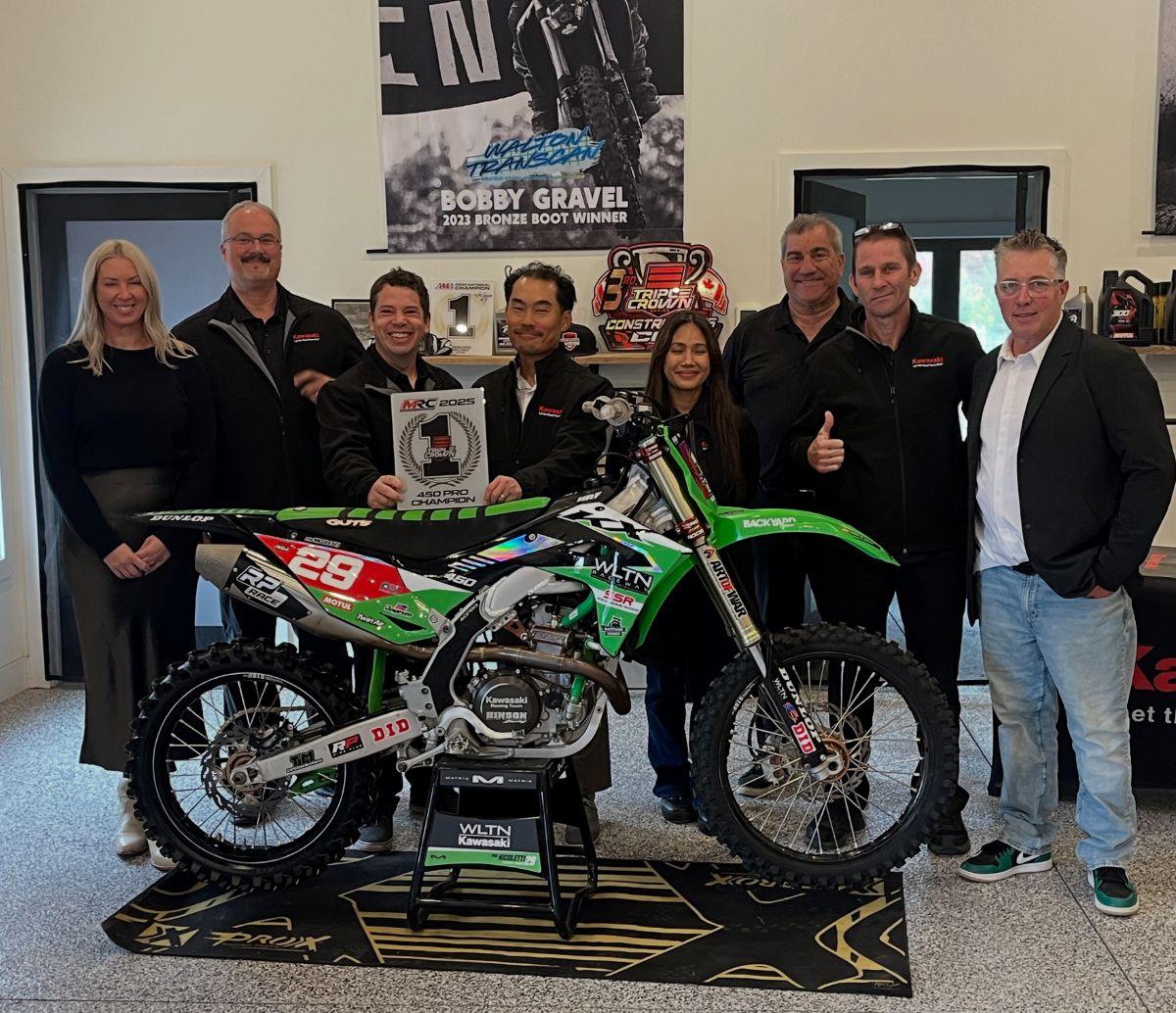 Moving from the Blu Cru riders over to Team Green, this past Friday a large group of us were invited over to Walton Raceway to witness the WLTN Kawasaki Team presentation of their #1 plate to the President of Canadian Kawasaki Motors Inc. It was a great afternoon with not just the Canadian Kawasaki President in attendance, but also the entire Canadian Kawasaki Marketing Team, as well as WLTN Kawasaki Team supporters and valued sponsors. Even Blake Hall from Hall Race Fuel made the long drive from Huntsville, Ontario to be there. It was a great day that began with an emotional speech from Brett Lee. During his 20 minute speech, Brett spoke about how the WLTN Kawasaki Team was able to go from start-up to winning a 450 Triple Crown Series Championship in just three short years. Brett gave credit to partnering with a storied brand like Kawasaki, the “never say die” attitude of Phil Nicoletti, as well as the hard work and determination of his wife Melody, as well as Steve Simms. It’s always nice to hang out at Walton Raceway when you’re not under the daily stress of the Walton TransCan. As you can imagine, the facility looks a little different in late October than it does in mid-August when the paddock is full of riders and their families, and the track is a buzz with TransCan motos. However, I always enjoy seeing things in a contrasting fashion, so it was nice to walk around the track while enjoying the peace and tranquility of having no one on it. Thank you to the Walton crew for having us out, and congratulations to everyone involved this year with the WLTN Kawasaki Team.