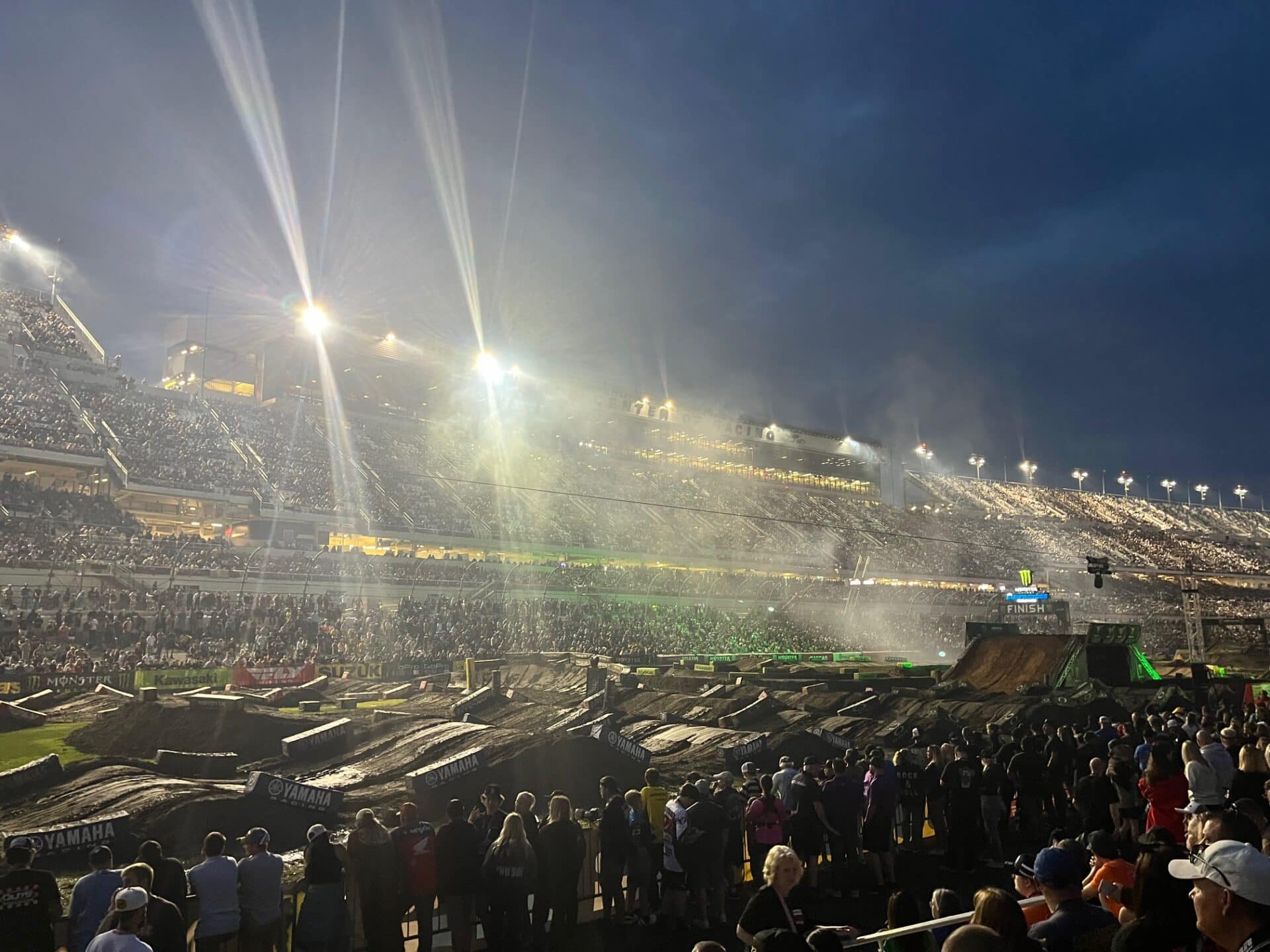 After travelling home and then back to Florida again, it was time to head to the Daytona SX on Saturday. I haven’t been to the World’s toughest SX since the last time I raced there in 1998. That was my fourth time racing the Daytona SX, and looking back I feel extremely fortunate to have lined up at this race several times. In those days, the track was a completely different animal as the track builders would build a few jumps out of trucked in clay, but the rest of the obstacles were just dug out of the ground. It was always rough, rutted, and with it being a day race in the 1990s, I always remember it being hot. Fast forward to this past weekend, and even before the intermittent rain showers during qualifying, the track had an old school look and feel to it. Even the top riders were struggling to find any type of flow or consistency with their laps. For instance, on one lap through the challenging rhythm section in front of the industry seating area, Ken Roczen made it through smooth and without any issues. Then on the following lap, he would hit an unexpected soft pocket of dirt, and it would throw him sideways and off of the track. It was like that for every rider, even Haiden Deegan would enter the danger zone with a mid-air dismount over one of the triples. Watching practice and qualifying instantly brought back memories of what it was like to be on the track and trying to find some sort of rhythm. The Daytona SX track is like nothing you have ever ridden before, and it takes some time to get used to the conditions. Saturday looked more like Gopher Dunes (on it’s worst day) with big jumps than a SX race. The main events looked more like survival than anything else, and then to witness both Aaron Plessinger and Dylan Ferrnadis have to part ways with their motorcycle in mid-air during the main event, and then instantly get back up and continue racing, was insane. Saturday’s conditions in Daytona made it look like these guys had forgotten how to ride a dirt bike. During the main events, I was thinking to myself that if the conditions looked bad from where I was seated ( 30 feet from the track at eye level) imagine how challenging it was to be out there trying to race on it!